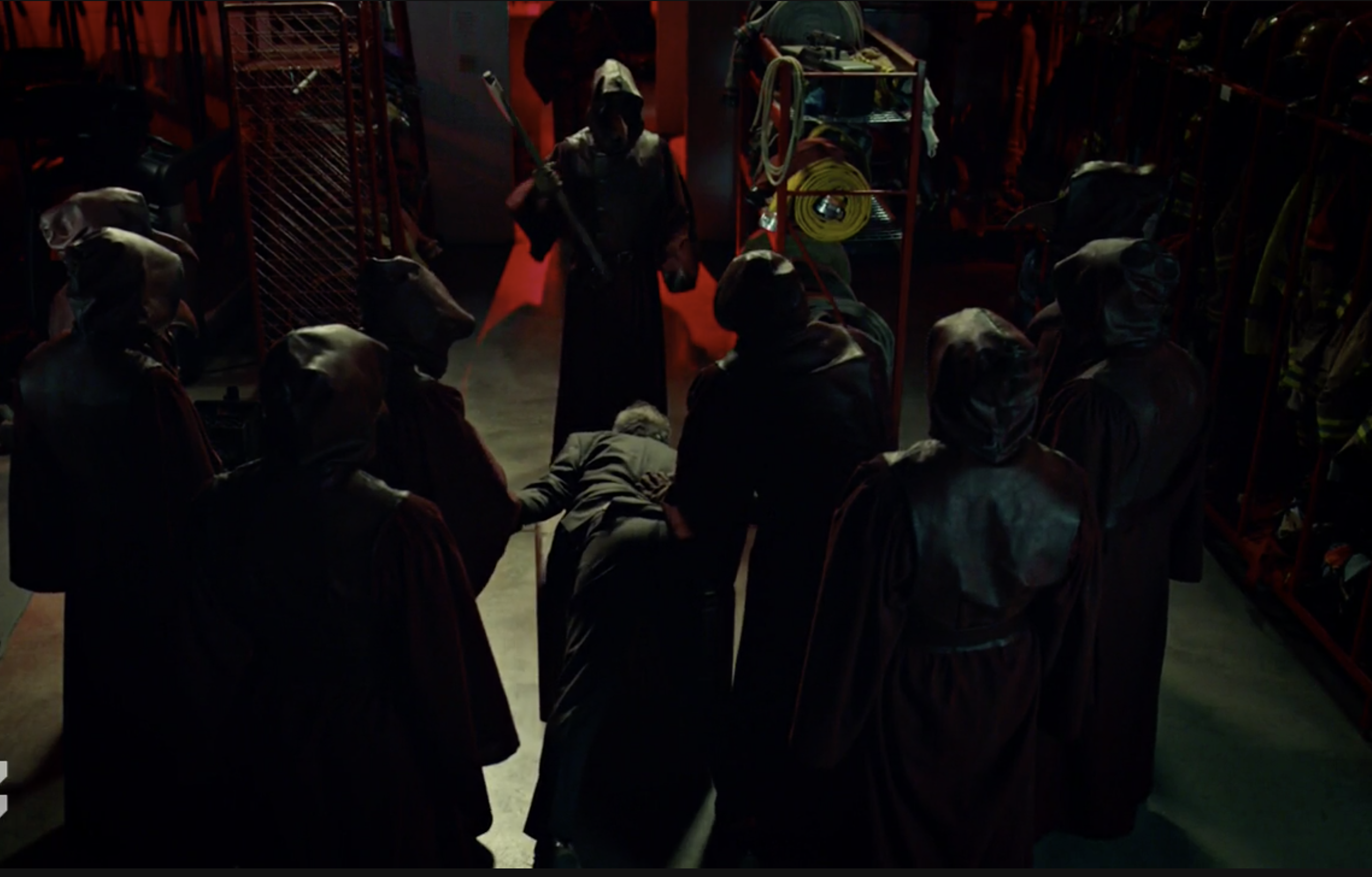 The episode opens with a man being dragged down a dark corridor by his legs. A group of robed figures in involved with this seeming abduction and there’s an axe and oh, shit we know where this is going…