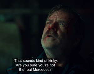 And Mercedes is looking pretty rough. Like…I dunno. Fresh Walking Dead rough. Sickly yellowish. She says she can keep him alive for a weeks in the most glorious pain and then she backhands him and Nedley says…