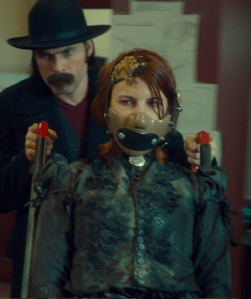 They’ve tied her to a dolly with her mouth taped and she’s pretty much immobilized. Wynonna asks where Rosita and Dolls are and Jeremy, still really pissed about having to use them at all, makes a snarky comment and Doc said that the blame can be sorted out later. Wynonna says they’ll talk about it later and Jeremy says, “oh, yeah. We will talk about it, Wynonna.” Damn. I like affronted Jeremy.