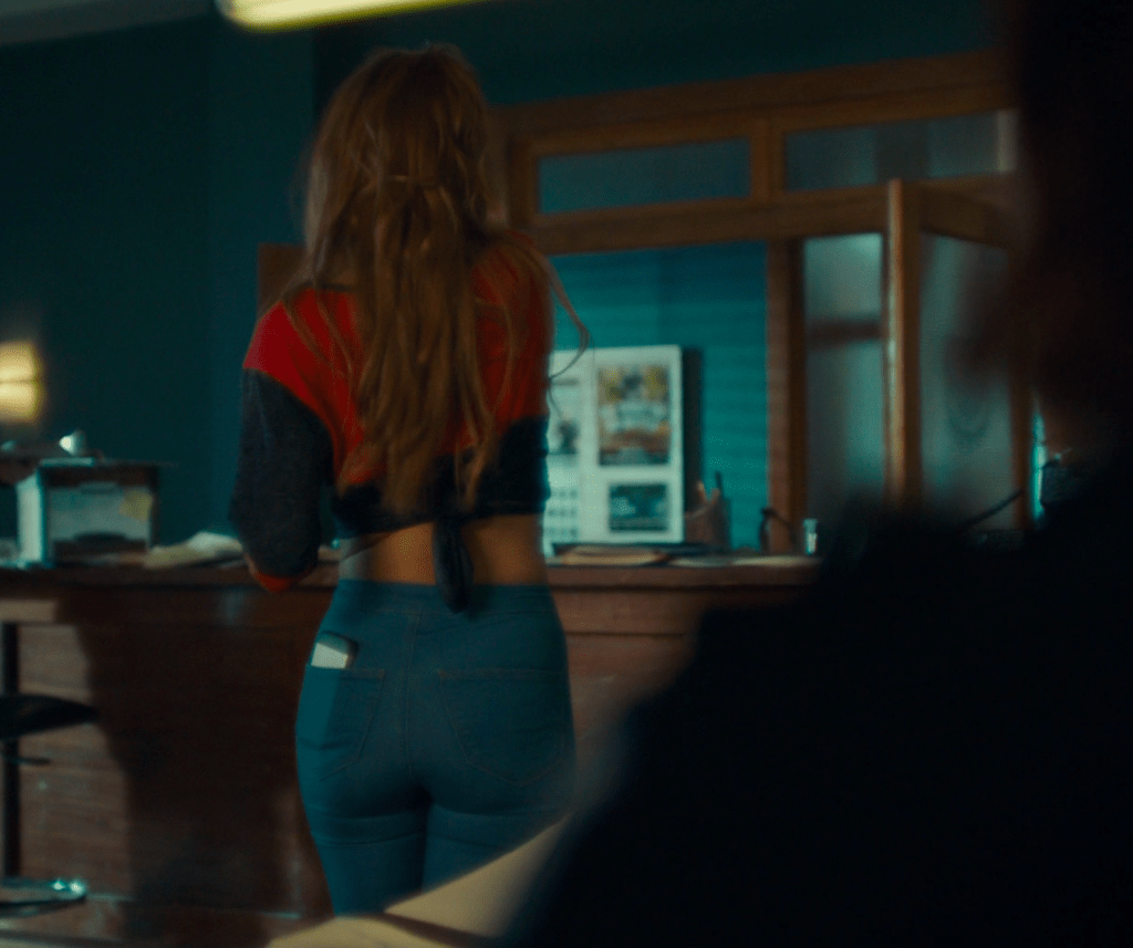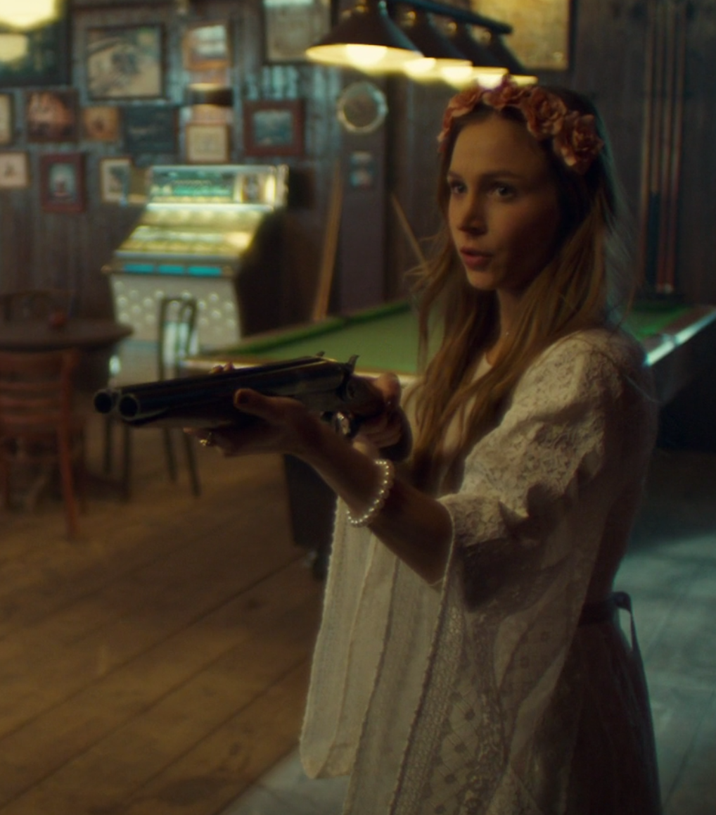 Okay we’re now back with alt-Waves looking at herself in the mirror. She’s wearing the dress and the…um…flower headband that goes with it (I am not an expert on headwear like this, friends, so please enlighten me!). It’s her mom’s dress, BTW, because she says to the mirror that she used to hate her (Mama) for leaving, but that she gets it, now, and that this town is too hard. From above, she hears breaking glass and she heads to the stairs to find out what’s going on. She’s got herself a shotgun, people. Let us all appreciate this for a moment (even though she’s pointing it at Doc):