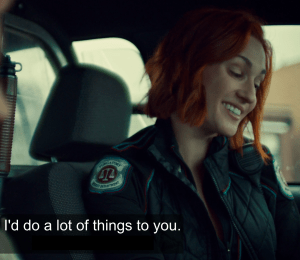 The next scene Waves is sitting in Nicole’s patrol car crying and Nicole is offering her tissues and Waves thanks her for coming to get her and Nicole is all worried about her (because of course she is!). And Waverly can’t understand why she is feeling this for Doc, who was insane and a criminal and a big part of the reason that Purgatory went to shit (damn, Doc. It IS a good thing Wynonna was around to keep you in check). And Waves says to Nicole, have you ever met someone and instantly known in your heart that they meant something to you? And Nicole says, “I might kinda get that, yeah…” Then Waves says that Doc told her to find the Iron Witch, and she thinks he meant an actual witch and is that crazy and Nicole says that this town is a haven for crazy and it’s supernatural central and Waves looks at her, surprised, and says, “I’ve never heard anyone say that out loud before. God. God, you’re brave.”