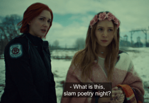 Last week Nicole was bitten by Widow Mercedes, and got to dying right quick because of the heinous-ness of the Widow venom. At the hospital, we find out that her next-of-kin is HER WIFE, Shae. But we also find out that Shae isn’t terrible and tells Waves that Nicole loves Waves like nobody’s business. Meanwhile, Waves is trying to figure out how to help Nicole. Widow Beth offers her a deal. Bring her the third seal (Doc’s ring) and she’ll help her out. Obvi, Waves doesn’t want to betray Wynonna, who is working with Dolls, Jeremy, and Rosita to find an anti-venom. Widow Mercedes kidnaps Sheriff Nedley because Wy entrusted him with Doc’s ring but Nedley doesn’t tell Mercedes anything. Wy and Doc have to find him, too.
