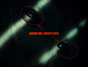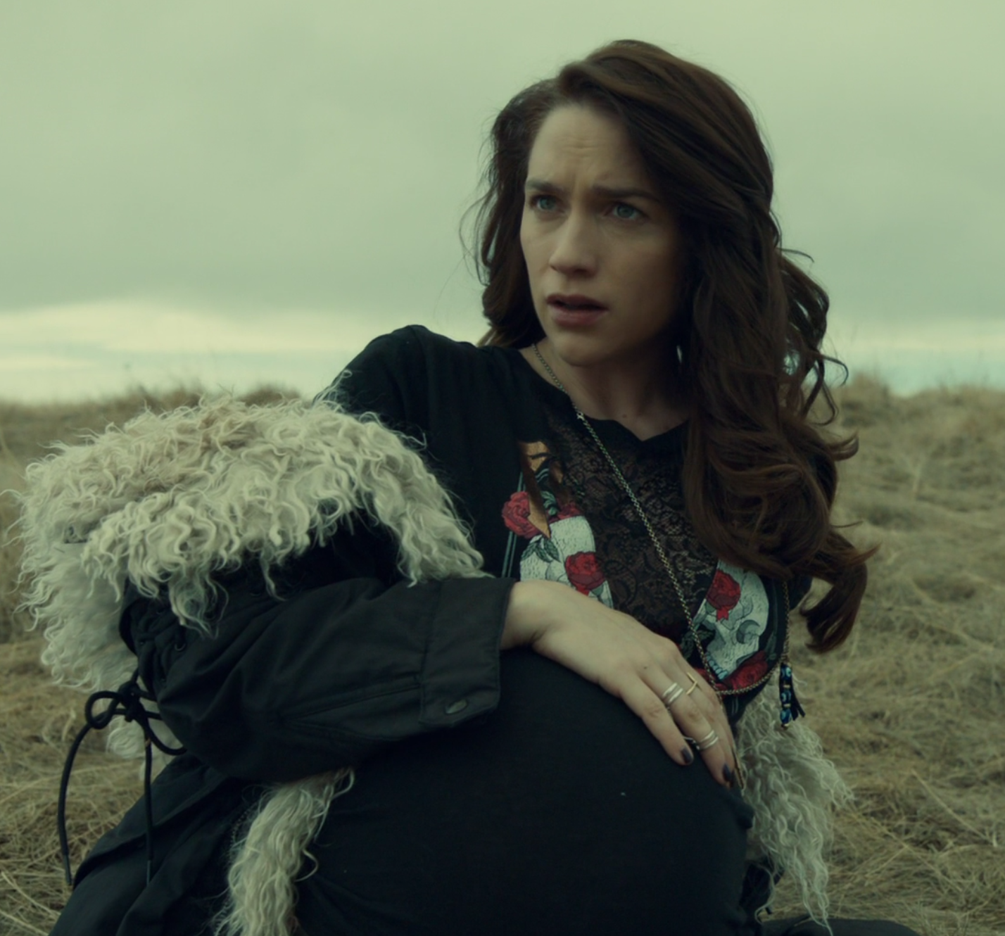 She looks around and sees Bobo and the Widows. She goes to where they just were and finds Doc’s ring all busted up and she realizes there is serious fuckery afoot, that the seal is broken. Then there’s a really scary demonic roaring and then Wynonna gets a pang — oh, shit! The baby’s coming! And the last thing we see is some dude’s eyes opening up…I’m guessing this is Clootie, in his coffin.