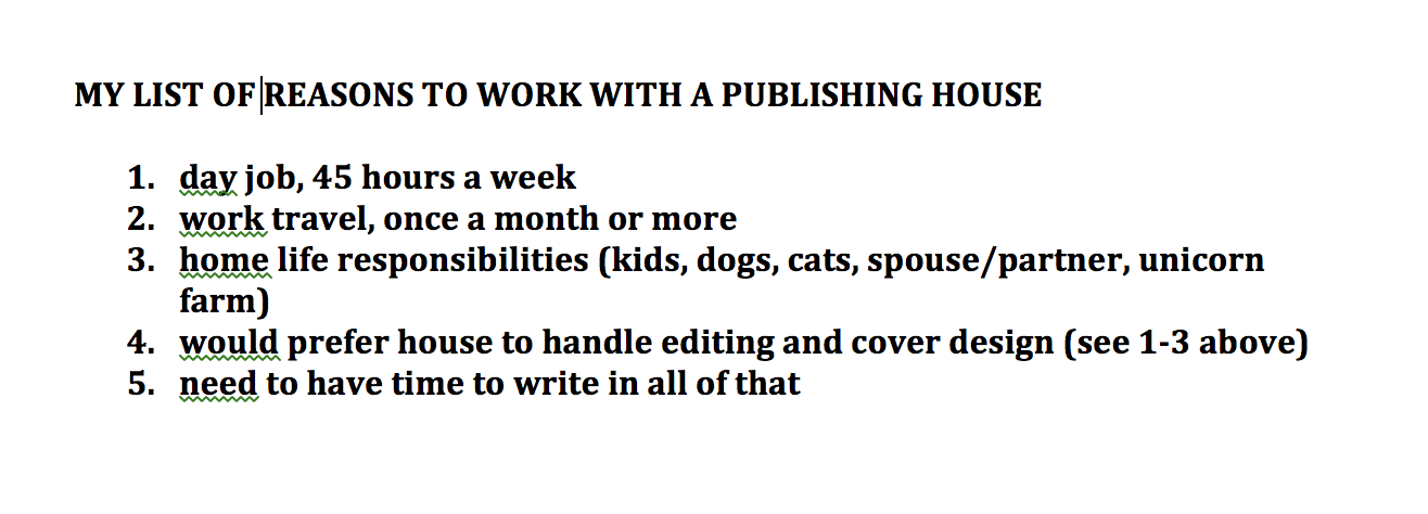 So think about your current time constraints, what your life circumstances are, and why working with a traditional house fits those. You can always try self-publishing if you work with a trad house (just make sure you’re not stepping on clauses in your trad house contracts), and maybe after you’ve worked with a trad house for a while you’ll move on to completely self-publishing. That’s fine, too. Just make sure you’re realistic about your goals as a writer and what exactly you’re looking for.
